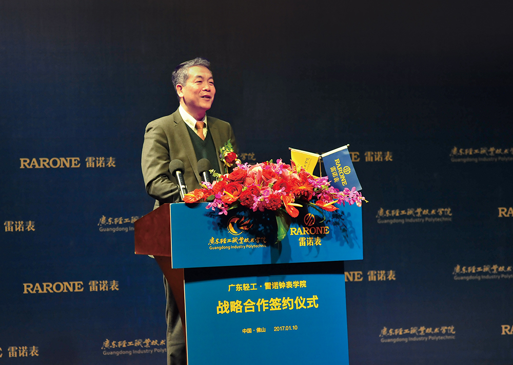 實體經(jīng)濟(jì)是國民經(jīng)濟(jì)的主體,是立國之本、興國之器、強(qiáng)國之基,“中國制造2025”提出,堅持“創(chuàng)新驅(qū)動、質(zhì)量為先、綠色發(fā)展、結(jié)構(gòu)優(yōu)化、人才為本”的基本方針,堅持“市場主導(dǎo)、政府引導(dǎo),立足當(dāng)前、著眼長遠(yuǎn),整體推進(jìn)、重點突破,自主發(fā)展、開放合作”的基本原則,通過“三步走”實現(xiàn)制造強(qiáng)國的戰(zhàn)略目標(biāo),而中國作為鐘表制造大國,如何從鐘表大國向鐘表強(qiáng)國轉(zhuǎn)型成為整個行業(yè)思考的重點!就在2017年1月10日,廣東輕工職業(yè)技術(shù)學(xué)院聯(lián)合中國著名鐘表企業(yè)深圳市雷諾表業(yè)有限公司,共同發(fā)起并創(chuàng)辦中國首家鐘表學(xué)院—廣東輕院·雷諾鐘表學(xué)院,她的誕生標(biāo)志著中國鐘表產(chǎn)業(yè)終于有了自己第一個教學(xué)基地。