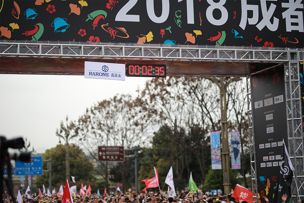 2018年3月18日,一年一度的成都雙遺馬拉松在都江堰隆重舉行。來自世界29個國家34個省市的3萬多名參賽選手齊聚馬拉松賽道起點。雷諾表作為賽事官方指定計時用表,為比賽事精準計時。在起跑倒計時5分鐘、3分鐘、1分鐘后鳴槍開跑,選手們激烈追逐、奔騰如流,場面十分激烈。